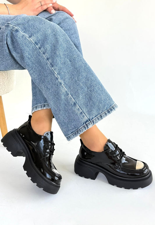 Kiya Siyah Rugan Dolgu Topuk Oxford Ayakkabı