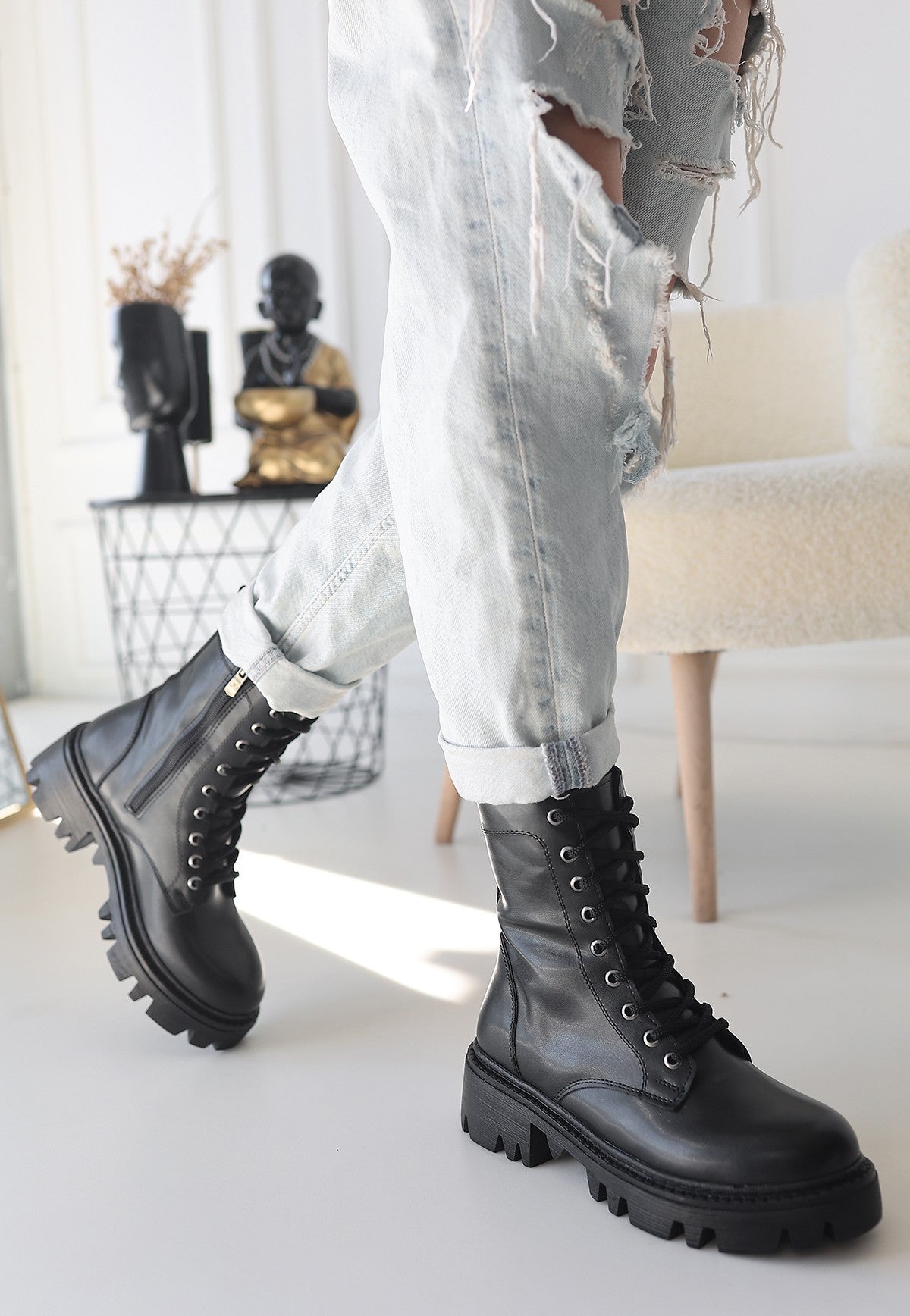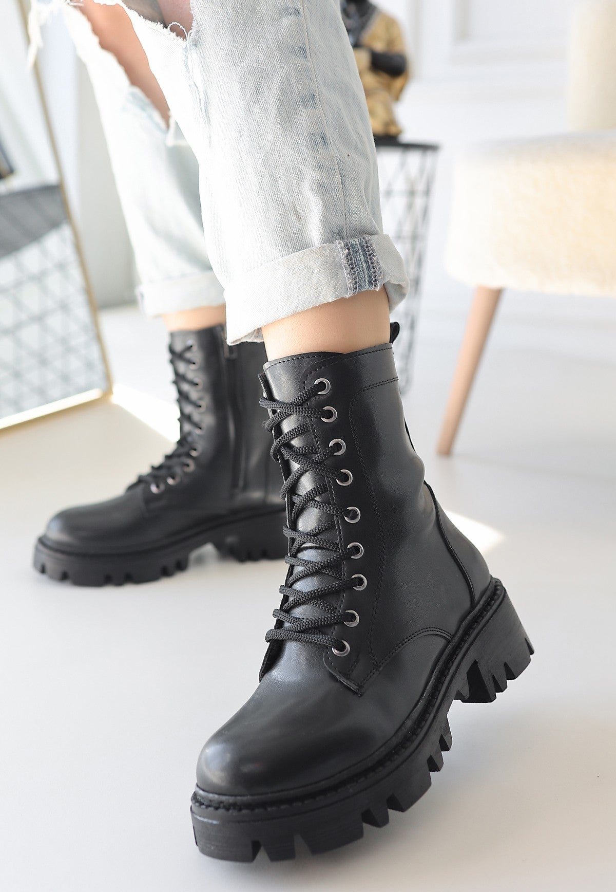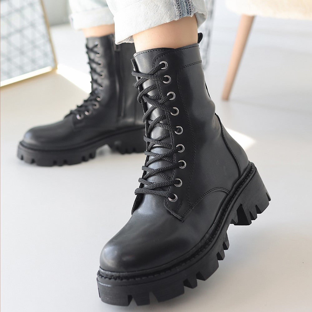 Flona Siyah Cilt Bağcıklı Bot