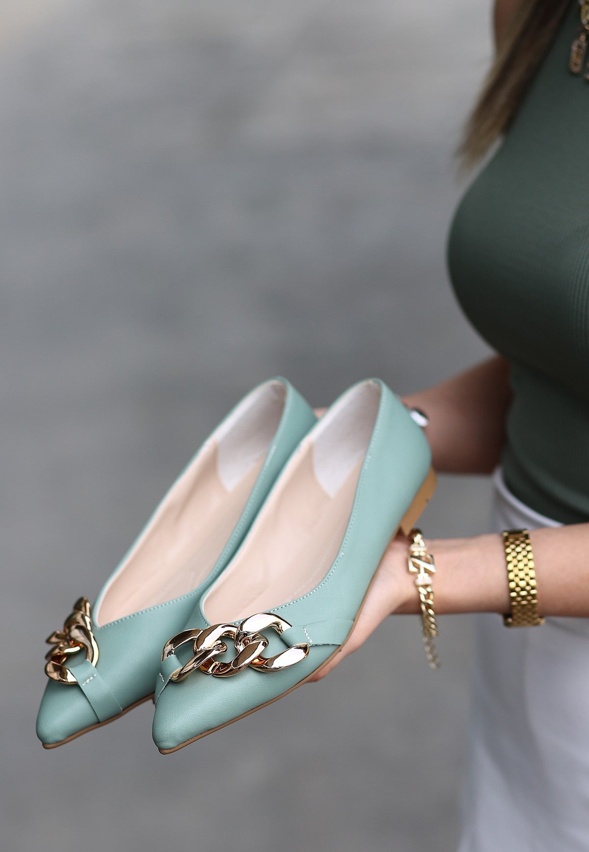 Popi Mint Yeşili Cilt Zincirli Babet Ayakkabı