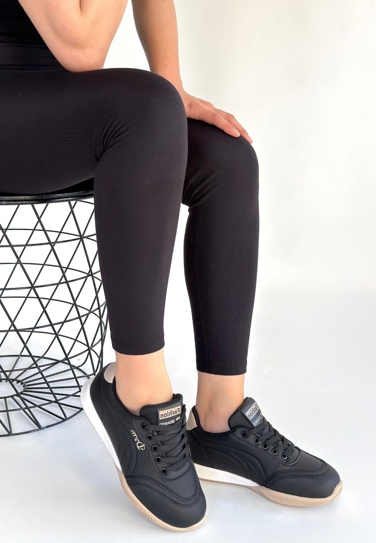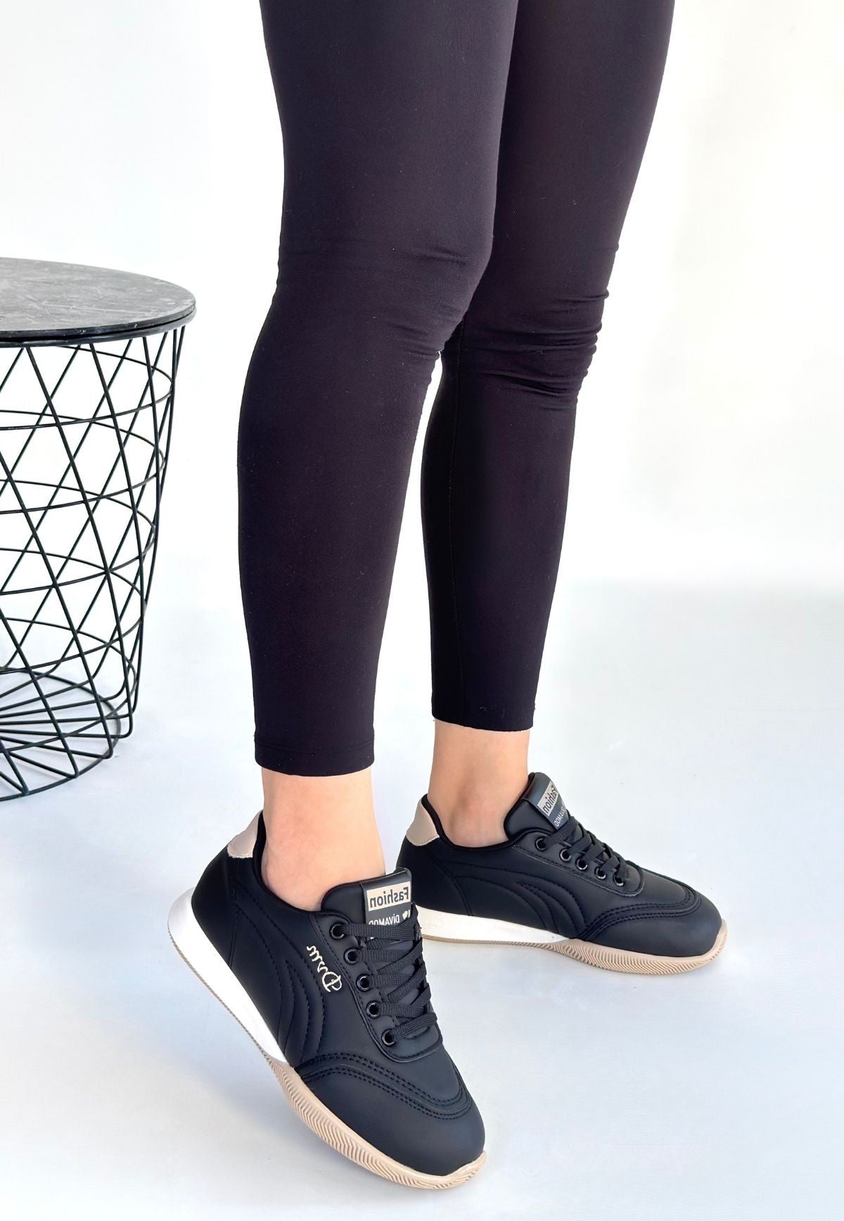 Tawen Siyah Cilt Bej Tabanlı Bağcıklı Spor Ayakkabı