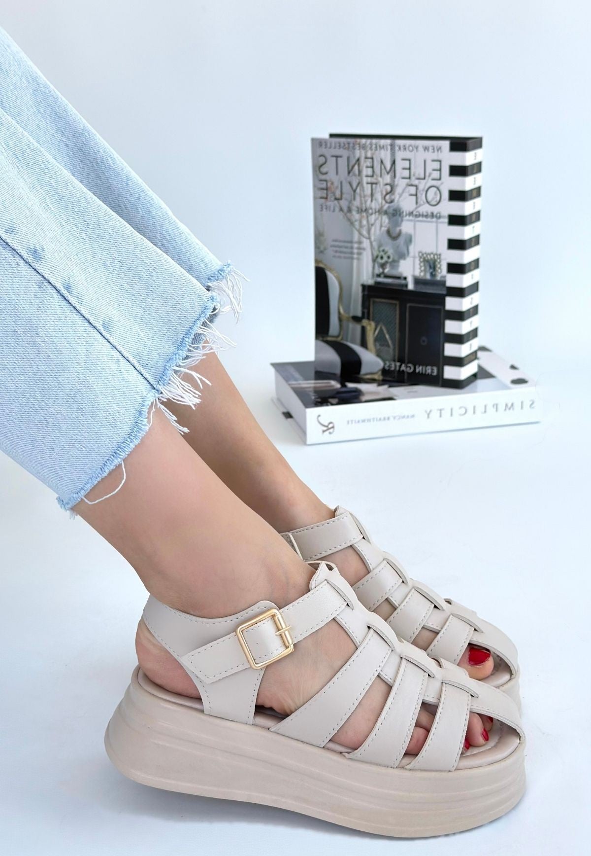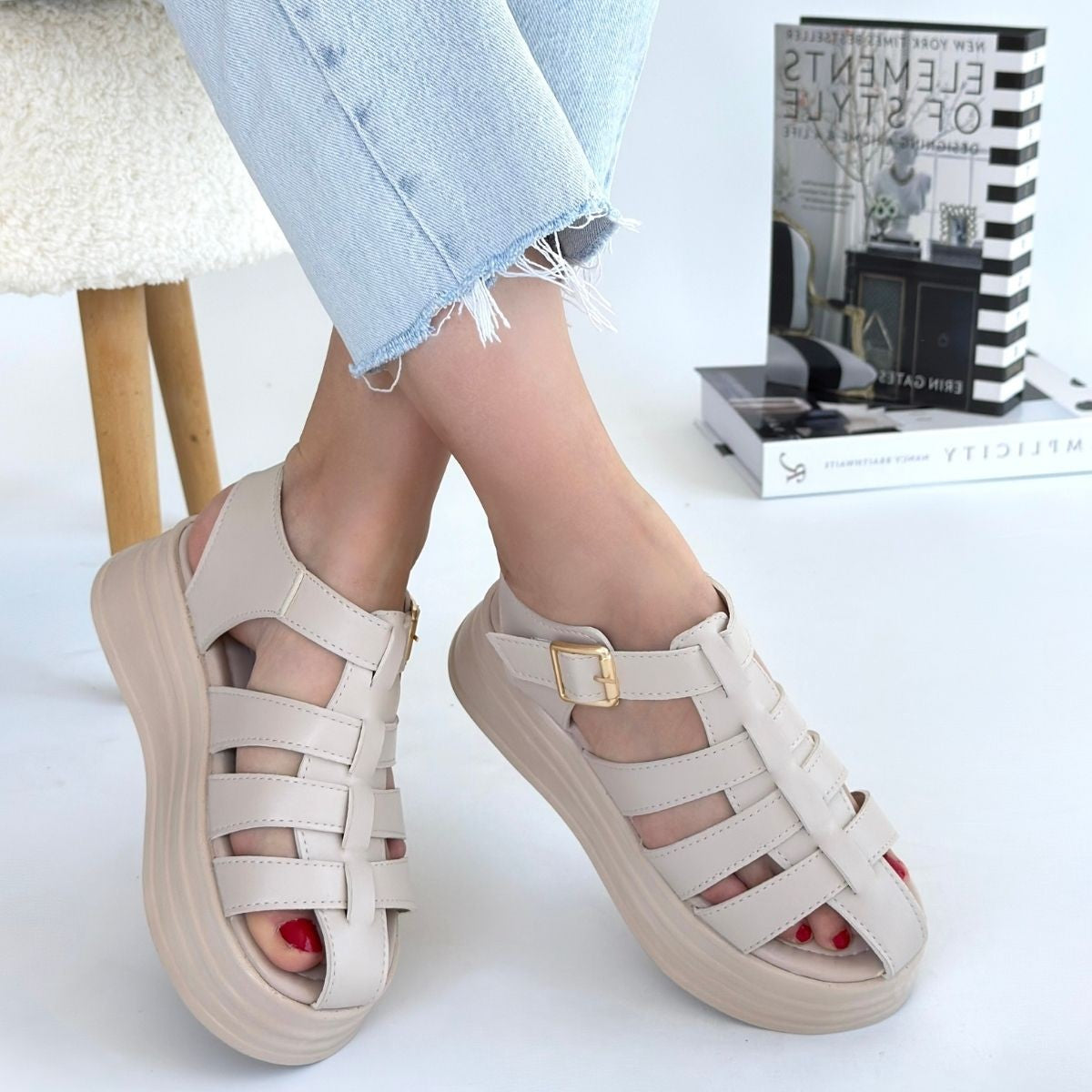 Toten Bej Cilt Kemerli Sandalet