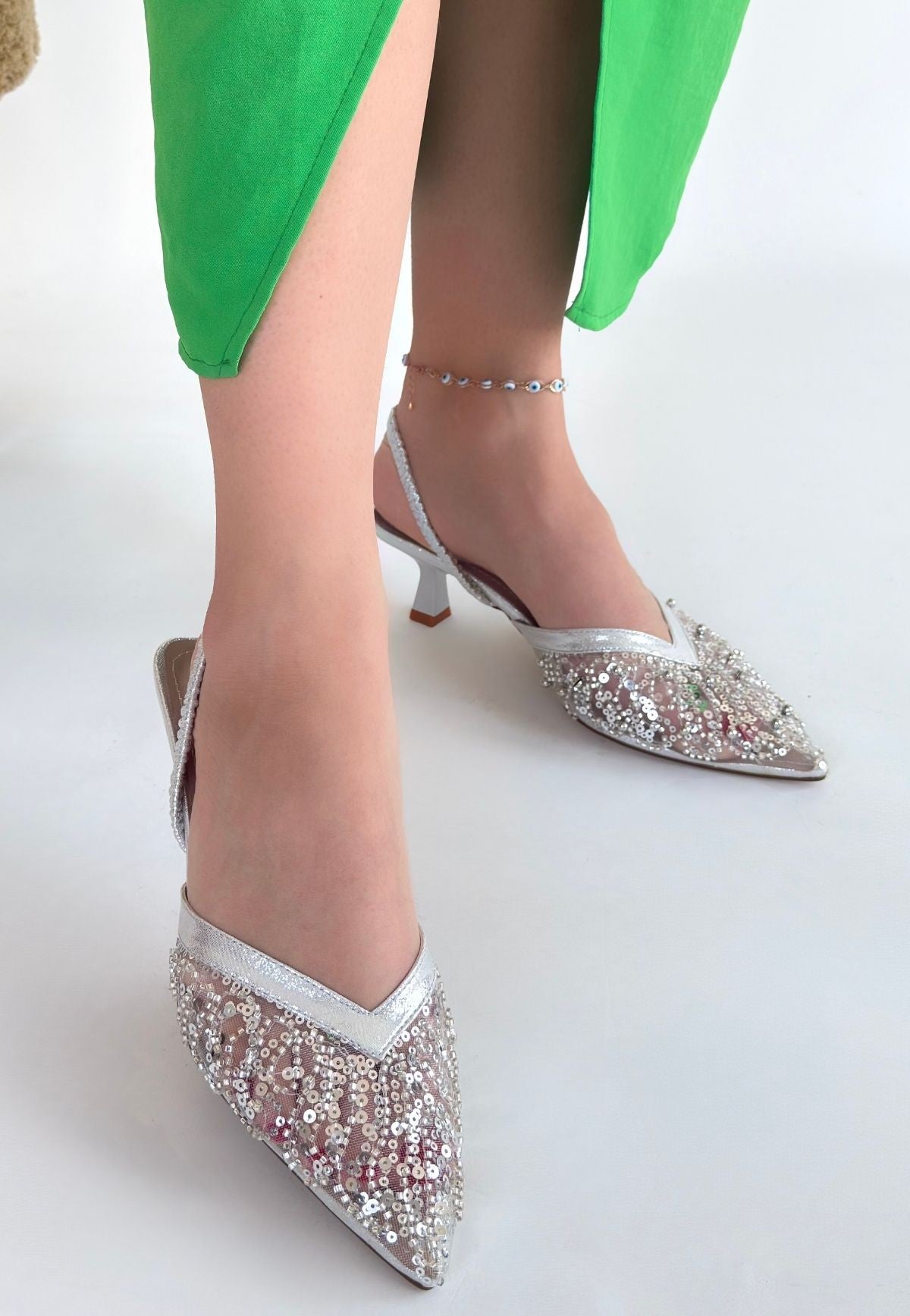 Toyi Gümüş Saten Topuklu Ayakkabı